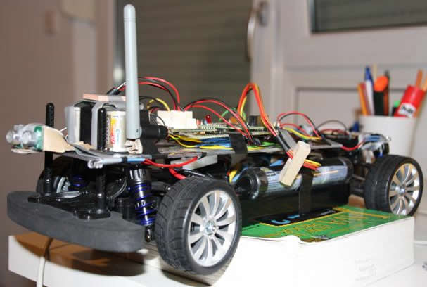 The car is equipped with two batteries, one for driving and steering the car and the other for powering up the micro controller and the rest of the sensors on top of the micro controller.
