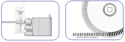 The optical shaft encoder uses an infrared light sensor to detect illumination from an infrared LED passing through color code in the circumference of a rotating wheel.